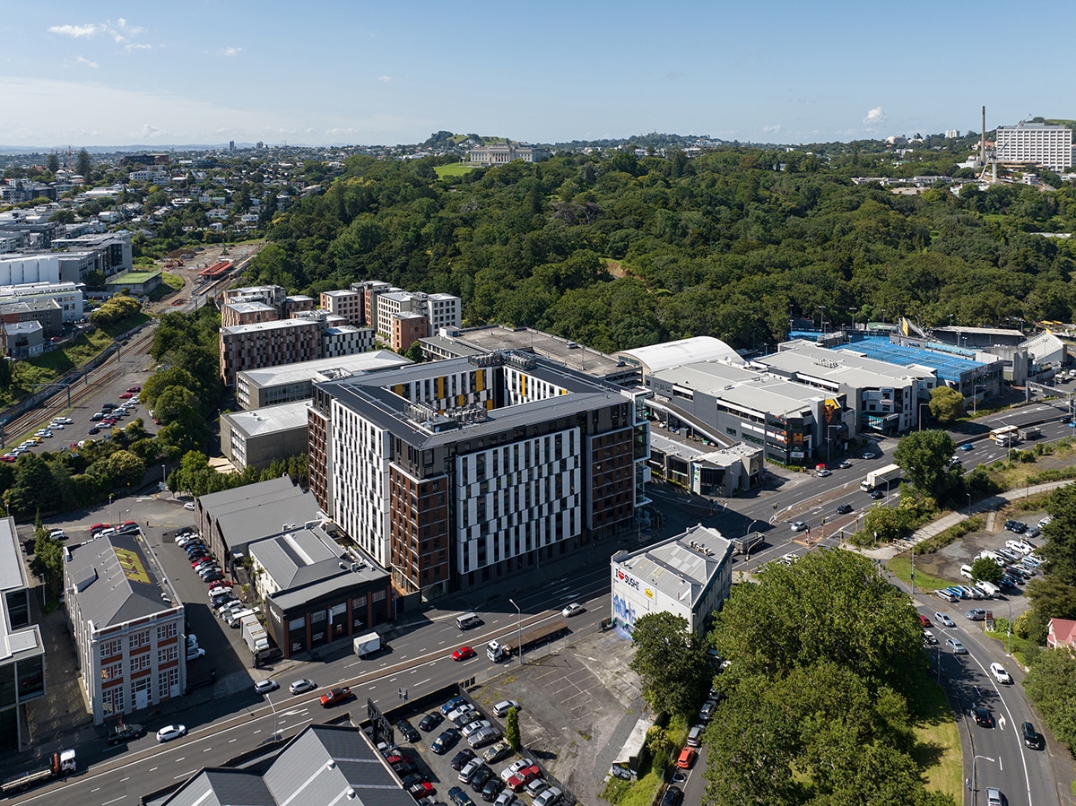 “The brief was to design a high-quality mixed-use student accommodation complex which contributes to the growing needs of the University of Auckland, its surroundings, and enhance access to the university campus from Carlaw Park.”